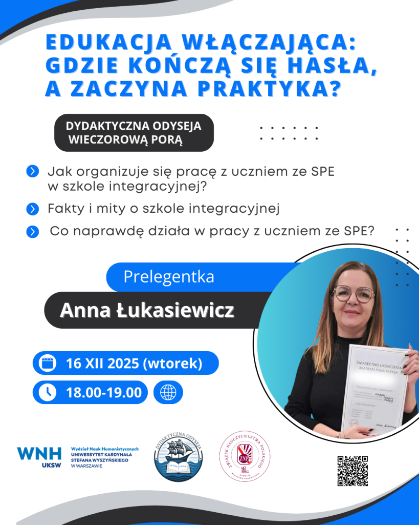 Serdecznie zapraszamy na wyjątkowy webinar, inaugurujący nowy cykl spotkań „Dydaktyczna Odyseja Wieczorową Porą”, których inicjatorem i organizatorem jest społeczność koła naukowego Dydaktyczna Odyseja, działającego na Wydziale Nauk Humanistycznych Uniwersytetu Kardynała Stefana Wyszyńskiego w Warszawie. Partnerem cyklu spotkań jest Oddział ZNP Warszawa-Śródmieście.