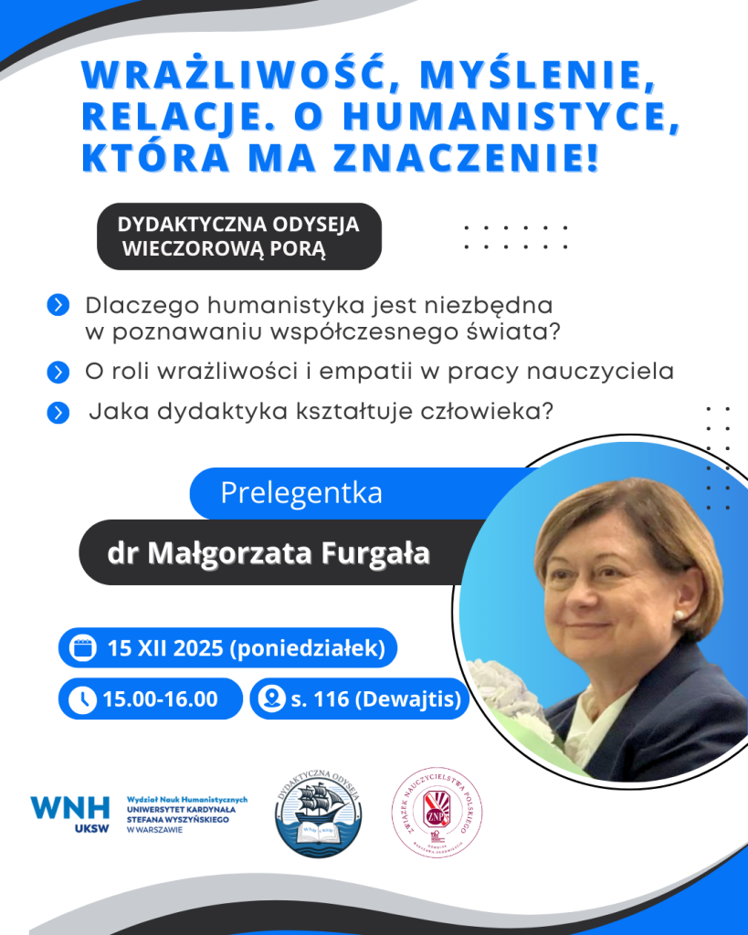 15 grudnia 2025 r. będziemy gościć na naszym Wydziale dr Małgorzatę Furgałę, doktor nauk humanistycznych, polonistkę i doświadczoną dydaktyczkę, której zawodowa droga obejmuje pracę we wszystkich typach szkół: od podstawowej, przez gimnazjum, po licea publiczne i niepubliczne. W latach 2001–2021 dr Furgała była związana z Katedrą Metodyki Nauczania Literatury i Języka Polskiego WNH UKSW, a dziś pełni funkcję wicedyrektorki niepublicznego liceum w Warszawie. W pracy ze studentami specjalizacji nauczycielskiej podkreślała znaczenie wartości w dydaktyce oraz w budowaniu relacji międzyludzkich w szkolnej codzienności.